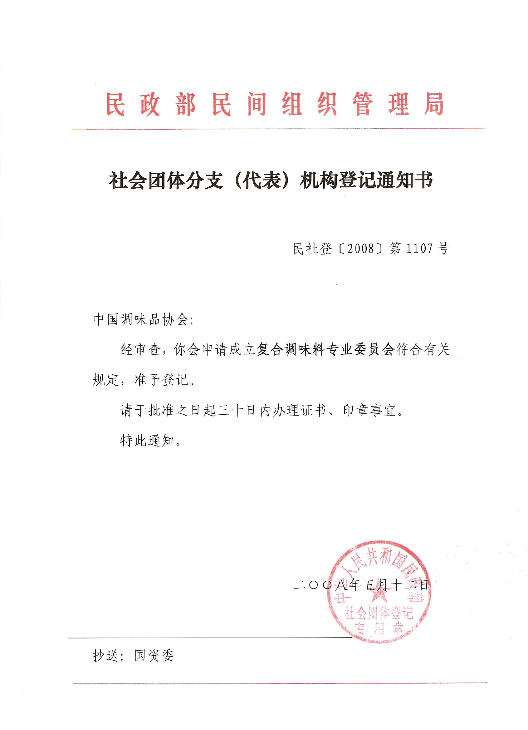 经中华人民共和国民政部(民社登[2008]第1107号文件)(见附件一)批准,好色先生tvapp(以下简称协会)复合调味料专业委员会正式成立。